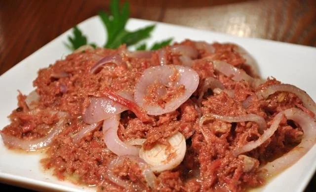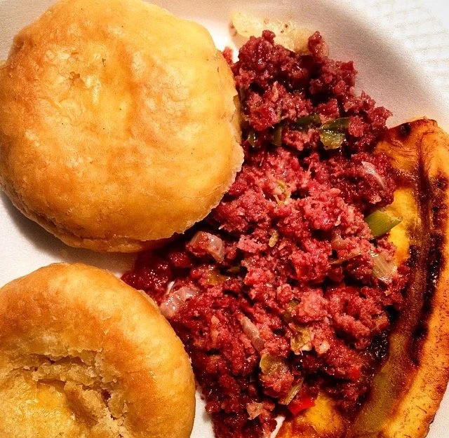 Fried bully beef: Sautéed with onions, tomatoes, Scotch bonnet peppers, thyme. Eaten with fried dumplings, boiled bananas, or breadfruit.